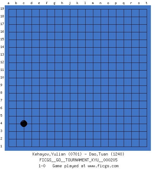 Last move : 1-0 2020 October 27 12:20:29 [Event "FICGS__GO__TOURNAMENT_KYU__000205"] [Site "FICGS"] [Date "2020.09.22"] [Round "1"] [Black "Kehayov,Yulian"] [White "Dao,Tuan"] [Result "1-0"] [Rating 1 "0701"] [Rating 2 "1240"] 1.c4 1-0 This go game has been lost on time (started : 2020.09.22 13:42:12) Here are the names of the openings (joseki) played in the four corners : Corner d4 : c4 1-0 Komoku (Somok, Xiao~mu`) 3-4 Point. The komoku (3-4) point is the traditional corner enclosure move.. Player Black won this Go (weiqi, baduk) game. Follow this game move after move (download)Don't try to enclose an open skirt. (Anonymous) As the days dwindle down... to a precious few. (Maxwell Anderson)