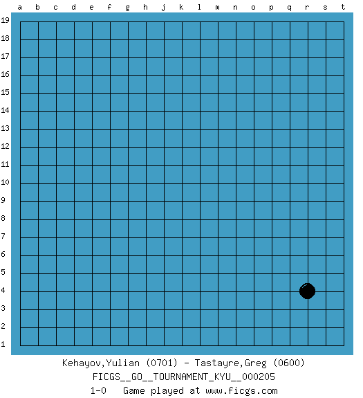 Last move : 1-0 2020 October 27 12:20:29 [Event "FICGS__GO__TOURNAMENT_KYU__000205"] [Site "FICGS"] [Date "2020.09.22"] [Round "1"] [Black "Kehayov,Yulian"] [White "Tastayre,Greg"] [Result "1-0"] [Rating 1 "0701"] [Rating 2 "0600"] 1.r4 1-0 This go game has been lost on time (started : 2020.09.22 13:42:12) Here are the names of the openings (joseki) played in the four corners : Corner q4 : r4 1-0 Komoku (Somok, Xiao~mu`) 3-4 Point. The komoku (3-4) point is the traditional corner enclosure move.. Player Black won this Go (weiqi, baduk) game. Follow this game move after move (download)If your stone is capped, play the knight's move. (Anonymous) You can't play chess if you're groggy from pills. (Anatoly Karpov)