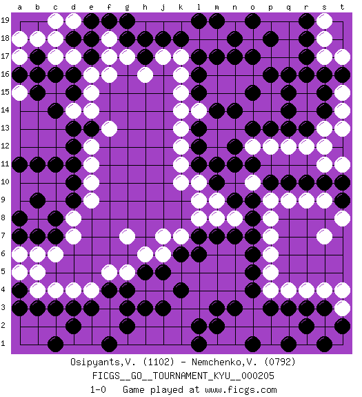 Last move : 1-0 2021 January 13 16:36:13 [Event "FICGS__GO__TOURNAMENT_KYU__000205"] [Site "FICGS"] [Date "2020.09.22"] [Round "1"] [Black "Osipyants,Vladimir"] [White "Nemchenko,Valery"] [Result "1-0"] [Rating 1 "1102"] [Rating 2 "0792"] 1.q16 d4 2.c16 q4 3.e17 e16 4.d16 f16 5.d13 e15 6.d15 e14 7.e13 f13 8.d10 e12 9.d12 e11 10.d11 e10 11.o17 k16 12.q10 k10 13.l13 k13 14.l12 k12 15.l11 k11 16.l17 k17 17.l16 k15 18.l15 l14 19.m14 k14 20.k4 f17 21.e18 f18 22.f19 g19 23.e19 h18 24.c7 e9 25.d9 d8 26.c8 d7 27.c3 c4 28.d3 c6 29.f4 e4 30.e3 f5 31.g4 g5 32.k6 l10 33.n11 l18 34.m17 m18 35.n18 n19 36.o19 m19 37.k18 k19 38.l19 j19 39.o4 h6 40.r3 p5 41.o5 p6 42.o6 p7 43.o7 p8 44.o8 p9 45.m10 l9 46.q3 r4 47.s3 s4 48.p10 q9 49.r10 r9 50.s10 s9 51.t9 t8 52.t10 s7 53.o9 j7 54.l7 k7 55.l6 l8 56.j5 j6 57.h5 g7 58.b3 b4 59.a4 b5 60.j18 h19 61.h17 g17 62.g18 h16 63.b7 a5 64.a3 j17 65.h18 t3 66.t2 t4 67.r2 m9 68.n9 n8 69.n7 m8 70.m7 b6 71.a7 d14 72.c14 p4 73.p3 m13 74.n14 n13 75.o13 m12 76.m11 o10 77.o11 o14 78.r16 c9 79.b9 c10 80.c11 b10 81.b11 a10 82.a11 a9 83.a8 a6 84.pass o12 85.n12 p12 86.p13 q12 87.q13 r12 88.r13 n15 89.pass m15 90.pass p14 91.q14 p15 92.p16 o16 93.q15 n16 94.o15 s12 95.pass s13 96.s14 t14 97.s15 t11 98.pass s11 99.pass m18 100.pass p17 101.p18 q17 102.r17 q18 103.r18 q19 104.pass m16 105.pass l18 106.n17 n19 107.m19 p19 108.r19 t15 109.t16 t13 110.pass f3 111.g3 f2 112.g2 e2 113.d2 d1 114.f1 e1 115.c1 o3 116.s1 d17 117.d18 c17 118.b17 c18 119.pass c19 120.b16 d19 121.g19 b18 122.pass a17 123.a16 a18 124.pass t17 125.s16 s17 126.pass s18 127.pass s19 128.pass o2 129.m3 p2 130.m2 n2 131.n3 m1 132.l1 n1 133.l2 q2 134.q1 p1 135.o1 h4 136.h3 j4 137.j3 a15 138.b15 1-0 Follow this game move after move (download)The intersection is rarely neutral. (Pierre Audouard) There's always a bigger fish. (Qui-Gon Jinn in Star Wars ep.1)
