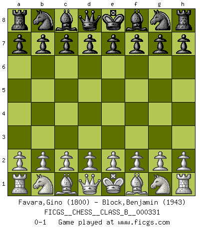 Last move : 0-1 2020 November 3 1:55:9 [Event "FICGS__CHESS__CLASS_B__000331"] [Site "FICGS"] [Date "2020.09.23"] [Round "1"] [White "Favara,Gino"] [Black "Block,Benjamin"] [Result "0-1"] [WhiteElo "1800"] [BlackElo "1943"] 0-1 This chess game has been lost on time (started : 2020.09.23 14:50:56) Player Black won this chess game. Follow this game move after move (download)It is the aim of the modern school, not to treat every position according to one general law, but according to the principle inherent in the position. (Richard Reti) Alles was ich jemals tun will ist Schach spielen. (Robert James Fischer) Te sientas frente a un tablero y repentinamente tu corazón brinca. Tu mano tiembla al tomar una pieza y moverla. Pero lo que el Ajedrez te enseña es que tu debes permanecer ahí con calma y pensar de que si realmente es una buena idea o de que si hay otras ideas mejores. (Stanley Kubrick) Le système Elo représente seulement une moyenne. Il est simplement un indicateur de votre stabilité. (Anatoli Karpov) Better than a thousand days of diligent study is one day with a great teacher. (Japanese proverb)