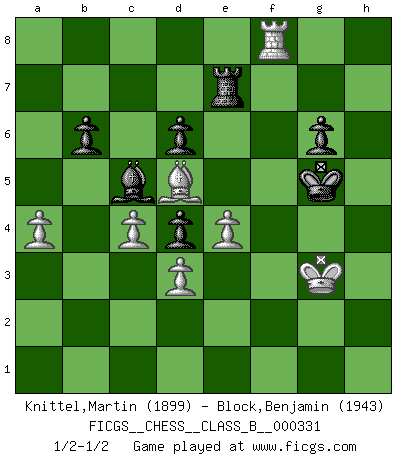 Last move : 1/2-1/2 2021 March 31 21:23:12 [Event "FICGS__CHESS__CLASS_B__000331"] [Site "FICGS"] [Date "2020.09.23"] [Round "1"] [White "Knittel,Martin"] [Black "Block,Benjamin"] [Result "1/2-1/2"] [WhiteElo "1899"] [BlackElo "1943"] 1.c4 e5 2.Nc3 Nf6 3.Nf3 Nc6 4.e4 Bb4 5.d3 d6 6.h3 O-O 7.Be2 Bc5 8.O-O a5 9.Be3 Nd4 10.Qd2 c6 11.Bd1 Nd7 12.Bxd4 exd4 13.Ne2 Qf6 14.Nh2 Ne5 15.Kh1 Ng6 16.f4 Qh4 17.Nf3 Qh6 18.Kh2 Bg4 19.f5 Qxd2 20.Nxd2 Bxe2 21.Bxe2 Ne5 22.Nf3 Nd7 23.Rac1 a4 24.Bd1 Rfe8 25.g4 h6 26.b3 axb3 27.Bxb3 Ra3 28.h4 g6 29.g5 hxg5 30.fxg6 fxg6 31.hxg5 Ne5 32.Nxe5 Rxe5 33.Rf6 Rxg5 34.Rcf1 Ra8 35.Rf7 Rh5+ 36.Kg3 Rg5+ 37.Kh3 Rg1 38.R1f6 b6 39.Kh2 Rg5 40.Rd7 Rf8 41.Rxf8+ Kxf8 42.Ba4 Re5 43.Bxc6 Re7 44.Rd8+ Kg7 45.a4 Kf6 46.Kg3 Re5 47.Rf8+ Kg5 48.Bd5 Re7 1/2-1/2 Follow this game move after move (download)A bad plan is better than none at all. (Frank Marshall) Schach ist Leben. (Robert James Fischer) Diferente gente reacciona diferentemente en aceptar la derrota. (Bobby Fischer) 'L'échange des dames est un coup dur pour les deux adversaires...' Un journaliste lors d'une partie du match Spassky-Fischer I fear not the man who has practiced 10,000 kicks once, but I fear the man who has practiced one kick 10,000 times. (Bruce Lee)
