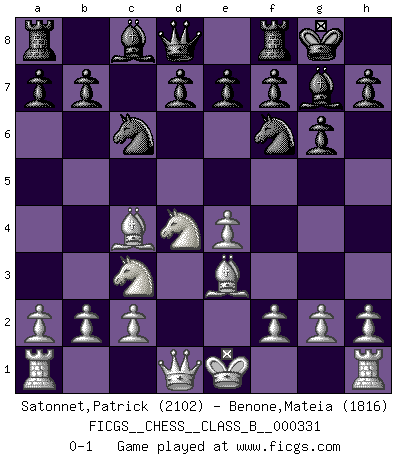Last move : 0-1 2020 December 15 12:26:46 [Event "FICGS__CHESS__CLASS_B__000331"] [Site "FICGS"] [Date "2020.09.23"] [Round "1"] [White "Satonnet,Patrick"] [Black "Benone,Mateia"] [Result "0-1"] [WhiteElo "2102"] [BlackElo "1816"] 1.e4 c5 2.Nf3 g6 3.d4 cxd4 4.Nxd4 Bg7 5.Nc3 Nc6 6.Be3 Nf6 7.Bc4 O-O 0-1 This chess game has been lost on time (started : 2020.09.23 14:50:56) Follow this game move after move (download)Discovered check is the dive bomber of the Chessboard. (Reuben Fine) Ich bin der einzige Schachspieler, der sich während der Vorbereitungen zum Turnier verletzt hat. (Woody Allen) Sin errores no puede haber brillantez. (Emanuel Lasker) Votre prénom est 'Tactique', votre deuxième prénom est 'Tactique' et votre nom est 'Tactique'. (Ken Smith) Creativity is allowing yourself to make mistakes. Art is knowing which ones to keep. (Scott Adams)