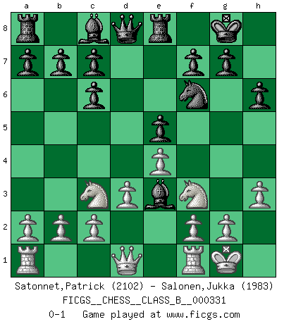 Last move : 0-1 2020 November 30 12:31:12 [Event "FICGS__CHESS__CLASS_B__000331"] [Site "FICGS"] [Date "2020.09.23"] [Round "1"] [White "Satonnet,Patrick"] [Black "Salonen,Jukka"] [Result "0-1"] [WhiteElo "2102"] [BlackElo "1983"] 1.e4 e5 2.Nf3 Nc6 3.Bb5 Nf6 4.d3 Bc5 5.Nc3 O-O 6.Bxc6 dxc6 7.h3 Re8 8.O-O h6 9.Be3 Bxe3 0-1 Follow this game move after move (download)I won't play with you anymore. You have insulted my friend. - When an opponent cursed himself for a blunder. (Miguel Najdorf) Nach Morphy wurde nichts neues mehr in der Behandlung offener Positionen gefunden. (Mikhail Moiseyevich Botvinik) La vida es como el Ajedrez, con lucha, competición y eventos buenos y malos. (Benjamin Franklin) Que feriez-vous si vous étiez en train de jouer aux échecs et que la fin du monde arrive ? Je continuerais à jouer. (Saint Borromée) CHESS, n. f. [echecs, Fr.] A nice and abstruse game, in which two sets of puppets are moved in opposition to each other. (Dr Samuel Johnson, A Dictionary Of The English Language, 1755)