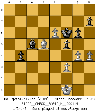 Last move : 1/2-1/2 2020 October 29 23:50:52 [Event "FICGS__CHESS__RAPID_M__000119"] [Site "FICGS"] [Date "2020.09.24"] [Round "1"] [White "Hallqvist,Niklas"] [Black "Mirra,Theodore"] [Result "1/2-1/2"] [WhiteElo "2109"] [BlackElo "2104"] 1.c4 e5 2.g3 Nf6 3.Bg2 d5 4.cxd5 Nxd5 5.Nc3 Nb6 6.Nf3 Nc6 7.a3 Be7 8.b4 O-O 9.O-O Be6 10.b5 Nd4 11.Rb1 f6 12.e3 Nxf3+ 13.Bxf3 Qc8 14.d4 Rd8 15.a4 a5 16.bxa6 Rxa6 17.Re1 Bf8 18.Bg2 c6 19.Bf1 Nc4 20.Qc2 Ra5 21.Rd1 Kh8 22.h4 Re8 23.Ne4 b5 24.axb5 cxb5 25.Bd2 Nxd2 26.Qxd2 Ra2 27.Rb2 Rxb2 28.Qxb2 exd4 29.exd4 Bf7 30.Nc5 Qg4 31.Ra1 Rb8 32.Be2 Qf5 33.Bd3 Qf3 34.Be4 Qg4 35.Qc2 Bg8 36.Qd3 Bc4 37.Qe3 Re8 38.Ra8 Rxa8 39.Bxa8 Qd1+ 40.Kh2 Qe2 41.Qf4 Bg8 42.Bg2 Qc4 43.Nd7 Be7 44.Nb8 Qc8 45.Nc6 Bf8 46.d5 Bc5 47.Nd4 b4 48.Qc1 Qc7 49.Ne6 Bxe6 50.dxe6 g6 51.Bd5 Kg7 52.Kg2 Qd6 53.Qc4 f5 54.f3 Be3 55.g4 Qc5 56.Qxc5 Bxc5 57.Kf1 Kf6 1/2-1/2 English Opening Kingside Castling by player Black (move 8) Kingside Castling by player White (move 9) This chess game ended in a draw. Follow this game move after move (download)Strategy requires thought, tactics require observation. (Max Euwe) Glücklicherweise sind Großmeister Ruben Fines reine Schachbücher weniger phallozentrisch [als seine Schachpsychologie] und deswegen auch weniger lächerlich. (Nigel Short) ¿Que sería del Ajedrez sin errores graciosos?. (Kurt Richter) Le profane ne songe pas à la somme de jouissance dont il se prive, qui méconnaît ce jeu aux ressources aussi variées que passionnantes. (Jean-Marie Jeanton-Lamarche) The ego is not master in its own house. (Sigmund Freud)