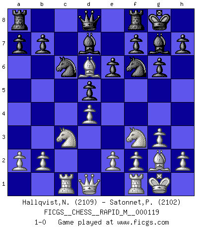 Last move : 1-0 2020 December 17 12:5:15 [Event "FICGS__CHESS__RAPID_M__000119"] [Site "FICGS"] [Date "2020.09.24"] [Round "1"] [White "Hallqvist,Niklas"] [Black "Satonnet,Patrick"] [Result "1-0"] [WhiteElo "2109"] [BlackElo "2102"] 1.c4 Nf6 2.g3 g6 3.Bg2 Bg7 4.Nc3 O-O 5.Nf3 c6 6.O-O d5 7.cxd5 cxd5 8.d4 e6 9.Bf4 Nc6 10.Rc1 Bd7 11.Bd6 1-0 This chess game has been lost on time (started : 2020.09.24 18:53:20) Follow this game move after move (download)Checkers is for tramps. (Paul Morphy) Um sich vor der Gefahr einer Erkältung zu schützen, sorge der wanderlustige König beizeiten für ein brauchbares Versteck. (Aaron Nimzowitsch) Del Ajedrez se ha dicho que la vida no es lo suficientemente larga para él, pero eso es culpa de la vida, no del Ajedrez. (William Ewart Napier) L'ordinateur a tué l'originalité. Il n'y a plus guère d'aventures sur l'échiquier. (Jacob Murray) There is no instance of a country having benefited from prolonged warfare. (Sun Tzu)