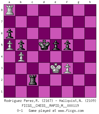 Last move : 0-1 2021 February 16 10:0:10 [Event "FICGS__CHESS__RAPID_M__000119"] [Site "FICGS"] [Date "2020.09.24"] [Round "1"] [White "Rodriguez Perez,Rene"] [Black "Hallqvist,Niklas"] [Result "0-1"] [WhiteElo "2167"] [BlackElo "2109"] 1.e4 e6 2.d4 d5 3.Bd3 dxe4 4.Bxe4 Nf6 5.Bf3 Be7 6.Nc3 c5 7.dxc5 Qxd1+ 8.Nxd1 Bxc5 9.Be3 Bb4+ 10.c3 Bd6 11.Bg5 h6 12.Bxf6 gxf6 13.Ne3 Bc7 14.O-O-O h5 15.Ne2 Nd7 16.Nd4 a6 17.g3 Ne5 18.Rhe1 Kf8 19.Bg2 Ng4 20.Re2 Rb8 21.h4 f5 22.Kc2 Rg8 23.Nxg4 hxg4 24.Nb3 f4 25.gxf4 Bxf4 26.Nc5 Ke7 27.h5 e5 28.a4 b6 29.Nd3 Kf6 30.Rh1 Bd7 31.b3 Rh8 32.h6 Bf5 33.Be4 Bxe4 34.Rxe4 Kf5 35.R4e1 Rbe8 36.h7 f6 37.Nxf4 Kxf4 38.Kd3 Re7 39.Re4+ Kf5 40.f3 g3 41.Rh5+ Kg6 42.Rh3 Rexh7 43.Rxg3+ Kf5 44.Rg2 Rh3 45.Rf2 Rc8 46.Kc2 Ke6 47.b4 b5 48.a5 Kf5 49.Re3 Rd8 50.Re4 Rc8 51.Re3 Rc6 52.Rfe2 Rd6 53.Rd2 Rxd2+ 54.Kxd2 Ke6 55.Rd3 f5 56.Ke2 Rh8 57.Kf2 Rc8 58.Ke1 Rc6 59.Rd8 Rxc3 60.Kf2 Rc4 61.Ra8 Rc2+ 62.Ke3 Kd5 0-1 Follow this game move after move (download)Chess, like love, like music, has the power to make people happy. (Siegbert Tarrasch) Ich liebe den Moment, wenn ich das Ego meines Gegenüber breche. (Robert James Fischer) Fischer sacrificó virtualmente todo lo que la mayoría de nosotros los 'debiles' (término que él usa) valoramos, respetamos y apreciamos por el amor de un astuto, a menudo hermoso tablero de juego, por el privilegio ambivalente de ser su mas grande maestro. (Paul Kollar) On entre au jeu d'Echecs comme on entre en Religion. Pour le joueur d'Echecs, la partie d'Echecs c'est l'office, la messe, le défilé du 1er Mai, le dépôt de gerbe au Monument aux Morts. C'est un drame sacré. (Michel Roos) If we knew what we were doing, we would not call it research. (Albert Einstein)