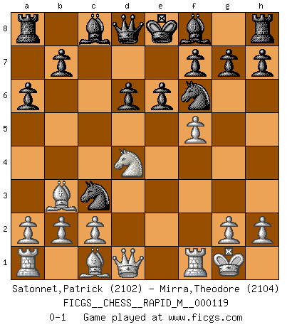 Last move : 0-1 2020 October 21 17:26:33 [Event "FICGS__CHESS__RAPID_M__000119"] [Site "FICGS"] [Date "2020.09.24"] [Round "1"] [White "Satonnet,Patrick"] [Black "Mirra,Theodore"] [Result "0-1"] [WhiteElo "2102"] [BlackElo "2104"] 1.e4 c5 2.Nf3 d6 3.d4 cxd4 4.Nxd4 Nf6 5.Nc3 a6 6.Bc4 e6 7.Bb3 Nbd7 8.O-O Nc5 9.f4 Ncxe4 10.f5 Nxc3 0-1 Sicilian : Najdorf, Lipnitzky attack Kingside Castling by player White (move 8) Player Black won this chess game. Follow this game move after move (download)Life is a kind of Chess, with struggle, competition, good and ill events. (Benjamin Franklin) Du musst nicht gut spielen, es reicht, wenn du besser spielst als dein Gegner. (Anonymous) Vive, pierde y aprende al observar a tu oponente como gana. (Amber Steenbock) Les Echecs, c'est l'art de la guerre sans les charniers, c'est la résurrection des morts tombés au champ d'honneur, l'espoir perpétuel, la suprématie de l'intelligence sur la force, la culture de l'esprit. (F. Szpiner) At last I discovered the true beauty of chess. So I proposed to her. (Dinesh De Silva)