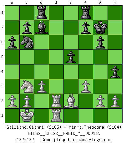 Last move : 1/2-1/2 2020 October 11 14:49:11 [Event "FICGS__CHESS__RAPID_M__000119"] [Site "FICGS"] [Date "2020.09.24"] [Round "1"] [White "Galliano,Gianni"] [Black "Mirra,Theodore"] [Result "1/2-1/2"] [WhiteElo "2105"] [BlackElo "2104"] 1.e4 c5 2.Nf3 d6 3.d4 cxd4 4.Nxd4 Nf6 5.Nc3 a6 6.Be3 e5 7.Nb3 Be6 8.f3 h5 9.Nd5 Bxd5 10.exd5 Nbd7 11.Qd2 g6 12.O-O-O Nb6 13.Kb1 Nfxd5 14.Bf2 Nf6 15.Bh4 Be7 16.Bxf6 Bxf6 17.Qxd6 Qxd6 18.Rxd6 Bd8 19.Rd2 O-O 20.Be2 Rc8 21.Rd6 Bc7 22.Rd2 Na4 23.c3 Kg7 24.Rhd1 h4 25.Rd5 Nb6 26.R5d2 1/2-1/2 Sicilian : Najdorf, Byrne (English) attack Queenside Castling by player White (move 12) Kingside Castling by player Black (move 19) This chess game ended in a draw. Follow this game move after move (download)We like to think. (Gary Kasparov) Schach ist das schnellste Spiel der Welt, weil man in jeder Sekunde Tausende von Gedanken ordnen muß. (Albert Einstein) El Ajedrez se juega con la mente... ¡no con las manos!. (Renaud y Kahn) Des combinaisons [dans le jeu d'échecs] pareilles à des mélodies. Je crois entendre pour ainsi dire la musique des coups... (Vladimir Nabokov) Lottery : A tax on people who are bad at math. (Author unknown)