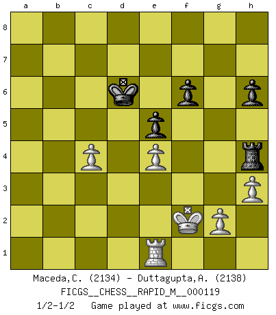Last move : 1/2-1/2 2021 March 2 19:43:26 [Event "FICGS__CHESS__RAPID_M__000119"] [Site "FICGS"] [Date "2020.09.24"] [Round "1"] [White "Maceda,Coco"] [Black "Duttagupta,Aniruddha"] [Result "1/2-1/2"] [WhiteElo "2134"] [BlackElo "2138"] 1.e4 c5 2.Nf3 d6 3.d4 cxd4 4.Nxd4 Nf6 5.Nc3 a6 6.Bg5 Nbd7 7.Qe2 h6 8.Bh4 g6 9.f4 e5 10.fxe5 dxe5 11.Nb3 Bb4 12.Qf3 g5 13.Bf2 Nf8 14.a3 Bg4 15.Qg3 Bxc3+ 16.Qxc3 Ne6 17.h3 Bh5 18.Nc5 Nxc5 19.Qxc5 Qe7 20.Bd3 Qxc5 21.Bxc5 Rc8 22.Bb4 Nd7 23.O-O f6 24.b3 Rc6 25.Rf2 g4 26.Be2 Rg8 27.Re1 Rg5 28.a4 g3 29.Bxh5+ Rxh5 30.Rd2 Nc5 31.Bxc5 Rxc5 32.c4 Rh4 33.Rd3 b5 34.axb5 axb5 35.Rxg3 bxc4 36.Rc3 Ke7 37.Rxc4 Rxc4 38.bxc4 Kd6 39.Rf1 Ke6 40.Re1 Kd6 41.Kf2 1/2-1/2 Follow this game move after move (download)Chess is the art which expresses the science of logic. (Mikhail Botvinnik) Ich rechne überhaupt nicht voraus. Ich gewinne auch so. (Robert James Fischer) Por la belleza de sus partidas, la claridad de su juego y lo brillante de sus ideas, Fischer se creó el mismo como un artista de la misma estatura como Brahms, Rembrandt y Shakespeare. (David Levy) Aidez vos pièces, elles vous aideront. (Paul Morphy) Programmer - an organism that turns coffee into software. (Anonymous)