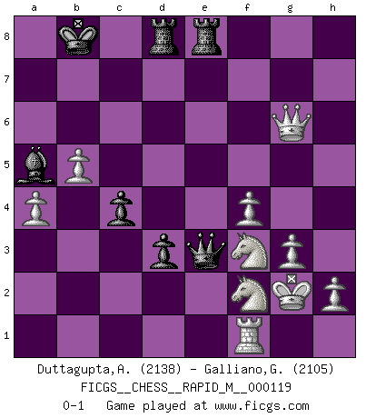 Last move : 0-1 2021 February 6 12:39:37 [Event "FICGS__CHESS__RAPID_M__000119"] [Site "FICGS"] [Date "2020.09.24"] [Round "1"] [White "Duttagupta,Aniruddha"] [Black "Galliano,Gianni"] [Result "0-1"] [WhiteElo "2138"] [BlackElo "2105"] 1.d4 d5 2.Nf3 Nf6 3.e3 c5 4.dxc5 e6 5.b4 a5 6.c3 axb4 7.cxb4 b6 8.Bb5+ Bd7 9.Bxd7+ Nbxd7 10.O-O bxc5 11.b5 Qb8 12.a4 g5 13.g3 g4 14.Nh4 Bd6 15.Qe2 Be5 16.Ra2 c4 17.f4 Bc7 18.Bb2 Rg8 19.Nc3 Ba5 20.Ng2 h5 21.Qc2 Qb6 22.Nd1 Ne4 23.Nf2 Nd2 24.Qh7 O-O-O 25.Qxf7 Kb8 26.Bd4 Nf3+ 27.Kh1 Nxd4 28.exd4 Qxd4 29.Qxe6 Nc5 30.Qf7 Rgf8 31.Qxh5 Ne4 32.Qxg4 Nd2 33.Rxd2 Qxd2 34.Qg6 Rfe8 35.Nh4 d4 36.Nf3 Qe3 37.Kg2 d3 0-1 This chess game has been lost on time (started : 2020.09.24 18:53:20) Follow this game move after move (download)Before the endgame, the Gods have placed the middle game. (Siegbert Tarrasch) Die jungen Leute sollen verstehen, dass sie noch etwas von mir lernen können und müssen. (Viktor Kortschnoi) En manos de Fischer's, una diminuta ventaja teórica es tan buena como tener una Reina de ventaja. (Isaac Kashdan) Vous n'êtes pas toujours obligé de jouer le meilleur coup. Un coup doit être actif, entreprenant, correct et beau ! (David Bronstein) The right perception of any matter and a misunderstanding of the same matter do not wholly exclude each other. (Kafka's the trial)