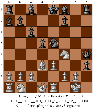 Last move : 0-1 2007 September 8 19:31:41 [Event "FICGS__CHESS__WCH_STAGE_1_GROUP_12__000003"] [Site "FICGS"] [Date "2007.07.11"] [Round "1"] [White "B. Lima,Edmilson"] [Black "Broniek,Mariusz Maciej"] [Result "0-1"] [WhiteElo "1613"] [BlackElo "1869"] 1.d4 Nf6 2.Bg5 Ne4 3.Bf4 d5 4.e3 e6 5.Bd3 Nc6 6.Ne2 g5 7.Bg3 Nxg3 8.Nxg3 e5 9.O-O h5 10.dxe5 Nxe5 11.Nxh5 g4 12.Nf4 c6 13.Re1 Qh4 14.h3 gxh3 0-1 This chess game has been lost on time (started : 2007.07.11 17:7:55) Trompowsky attack (Ruth, Opovcensky Opening) Kingside Castling by player White (move 9) Player Black won this chess game. Follow this game move after move (download)In complicated positions, Bobby Fischer hardly had to be afraid of anybody. (Paul Keres) Viele Opfer benötigen überhaupt keine konkrete Berechnung. Es genügt sich die entstehende Position kurz vorzustellen, um uns davon zu überzeugen, dass das Opfer korrekt ist. (Mikhail Nekhemyevich Tal) Las Aperturas te enseñan aperturas. ¡Los Finales te enseñan Ajedrez!. (Stephan Gerzadowicz) Le plus grand jeu de l'esprit jamais inventé, plus vous l'apprenez, plus vous y prenez du plaisir. (Garry Kasparov) The Movers & Shakers of this world are those who play chess in the mornings and go to the disco in the evenings. (Dinesh De Silva)