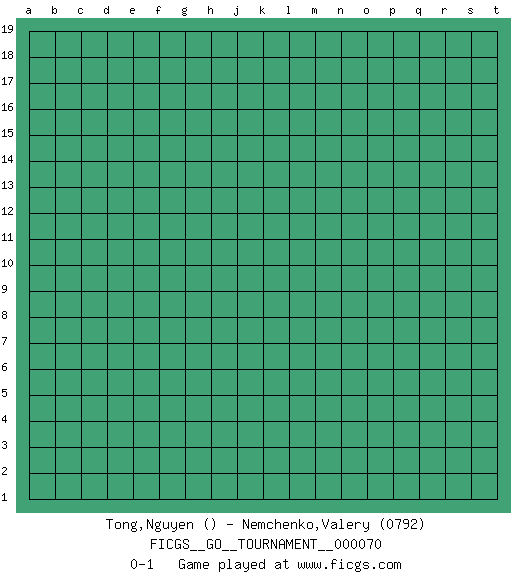 Last move : 0-1 2020 October 30 12:7:33 [Event "FICGS__GO__TOURNAMENT__000070"] [Site "FICGS"] [Date "2020.09.30"] [Round "1"] [Black "Tong,Nguyen"] [White "Nemchenko,Valery"] [Result "0-1"] [Rating 2 "0792"] 0-1 This go game has been lost on time (started : 2020.09.30 1:1:9) Here are the names of the openings (joseki) played in the four corners : Player White won this Go (weiqi, baduk) game. Follow this game move after move (download)Very few good moves are played. (Pierre Audouard) Whoever said the pen is mightier than the sword obviously never encountered automatic weapons. (US General Douglas MacArthur)