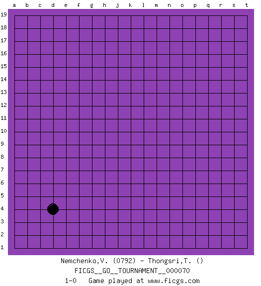 Last move : 1-0 2020 October 30 12:7:33 [Event "FICGS__GO__TOURNAMENT__000070"] [Site "FICGS"] [Date "2020.09.30"] [Round "1"] [Black "Nemchenko,Valery"] [White "Thongsri,Thassachon"] [Result "1-0"] [Rating 1 "0792"] 1.d4 1-0 This go game has been lost on time (started : 2020.09.30 1:1:9) Here are the names of the openings (joseki) played in the four corners : Corner d4 : d4 1-0 Hoshi (Hwajeom, Seongjeom, Xingwei`) 4-4 Point. The star or hoshi (4-4) point, emphasizing influence at the potential expense of territory. Player Black won this Go (weiqi, baduk) game. Follow this game move after move (download)Strange things happen at the one-two points. (Anonymous) Computers are like Old Testament gods; lots of rules and no mercy. (Joseph Campbell)