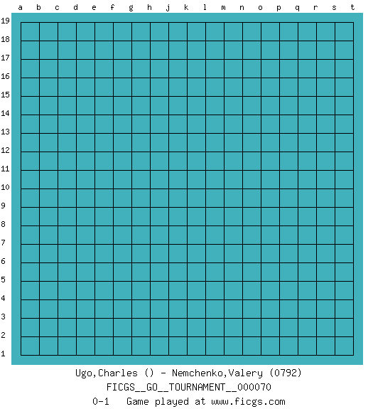 Last move : 0-1 2020 October 30 12:7:33 [Event "FICGS__GO__TOURNAMENT__000070"] [Site "FICGS"] [Date "2020.09.30"] [Round "1"] [Black "Ugo,Charles"] [White "Nemchenko,Valery"] [Result "0-1"] [Rating 2 "0792"] 0-1 This go game has been lost on time (started : 2020.09.30 1:1:9) Here are the names of the openings (joseki) played in the four corners : Player White won this Go (weiqi, baduk) game. Follow this game move after move (download)Keshi is worth as much as an invasion ! (Anonymous) History is the quarrels of popes and kings, with wars or pestilences in every page; the men all so good for nothing, and hardly any women at all. (Jane Austen)