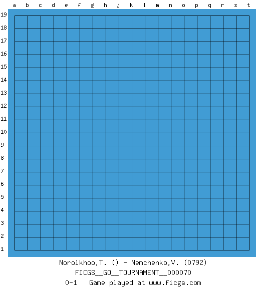 Last move : 0-1 2020 October 30 12:7:33 [Event "FICGS__GO__TOURNAMENT__000070"] [Site "FICGS"] [Date "2020.09.30"] [Round "1"] [Black "Norolkhoo,Tsewgee"] [White "Nemchenko,Valery"] [Result "0-1"] [Rating 2 "0792"] 0-1 This go game has been lost on time (started : 2020.09.30 1:1:9) Here are the names of the openings (joseki) played in the four corners : Player White won this Go (weiqi, baduk) game. Follow this game move after move (download)Everything happens on a grid-engraved board with black and white pieces, but if that's all you see then you don't know Go. (Pierre Audouard) The difference between perseverance and obstinacy is that one comes from a strong will, and the other from a strong won't. (Henry Ward Beecher)