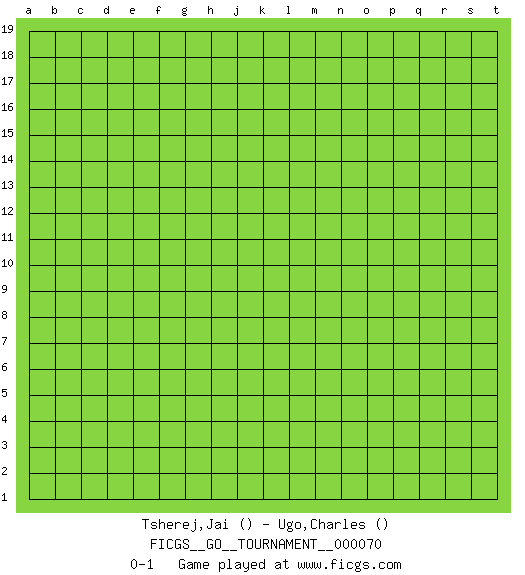 Last move : 0-1 2020 October 30 12:7:33 [Event "FICGS__GO__TOURNAMENT__000070"] [Site "FICGS"] [Date "2020.09.30"] [Round "1"] [Black "Tsherej,Jai"] [White "Ugo,Charles"] [Result "0-1"] 0-1 This go game has been lost on time (started : 2020.09.30 1:1:9) Here are the names of the openings (joseki) played in the four corners : Player White won this Go (weiqi, baduk) game. Follow this game move after move (download)The enemy's vital point is your own. (Anonymous) Men never do evil so completely and cheerfully as when they do it from religious conviction. (Blaise Pascal)