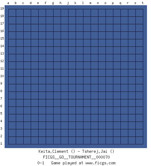 Last move : 0-1 2020 October 30 12:7:33 [Event "FICGS__GO__TOURNAMENT__000070"] [Site "FICGS"] [Date "2020.09.30"] [Round "1"] [Black "Keita,Clement"] [White "Tsherej,Jai"] [Result "0-1"] 0-1 This go game has been lost on time (started : 2020.09.30 1:1:9) Here are the names of the openings (joseki) played in the four corners : Player White won this Go (weiqi, baduk) game. Follow this game move after move (download)Go is to western chess what philosophy is to double entry accounting. (from Shibumi, by Trevanian) Even the best needles are not sharp at both ends. (Chinese proverb)
