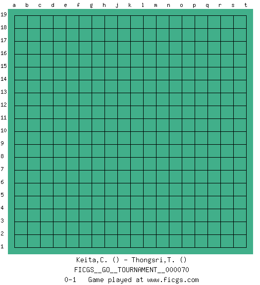 Last move : 0-1 2020 October 30 12:7:33 [Event "FICGS__GO__TOURNAMENT__000070"] [Site "FICGS"] [Date "2020.09.30"] [Round "1"] [Black "Keita,Clement"] [White "Thongsri,Thassachon"] [Result "0-1"] 0-1 This go game has been lost on time (started : 2020.09.30 1:1:9) Here are the names of the openings (joseki) played in the four corners : Player White won this Go (weiqi, baduk) game. Follow this game move after move (download)Those who are good at winning, don't usually fight. (Zhang) God, you are such an idiot. - Actually, I thought I was more of a jerk. (Gregory House to Stacy Warner, House M.D.)