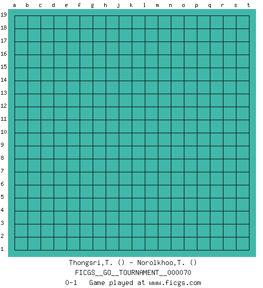 Last move : 0-1 2020 October 30 12:7:33 [Event "FICGS__GO__TOURNAMENT__000070"] [Site "FICGS"] [Date "2020.09.30"] [Round "1"] [Black "Thongsri,Thassachon"] [White "Norolkhoo,Tsewgee"] [Result "0-1"] 0-1 This go game has been lost on time (started : 2020.09.30 1:1:9) Here are the names of the openings (joseki) played in the four corners : Player White won this Go (weiqi, baduk) game. Follow this game move after move (download)Eyes win semiais. (Anonymous) Always be a first-rate version of yourself, instead of a second-rate version of somebody else. (Judy Garland)