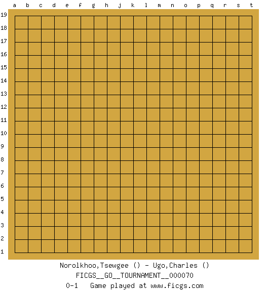 Last move : 0-1 2020 October 30 12:7:33 [Event "FICGS__GO__TOURNAMENT__000070"] [Site "FICGS"] [Date "2020.09.30"] [Round "1"] [Black "Norolkhoo,Tsewgee"] [White "Ugo,Charles"] [Result "0-1"] 0-1 This go game has been lost on time (started : 2020.09.30 1:1:9) Here are the names of the openings (joseki) played in the four corners : Player White won this Go (weiqi, baduk) game. Follow this game move after move (download)The monkey jump is worth eight points. (Anonymous) What doesn't kill us makes us stronger. (Friedrich Nietzsche)