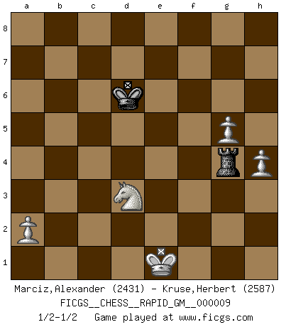 Last move : 1/2-1/2 2020 November 3 9:32:51 [Event "FICGS__CHESS__RAPID_GM__000009"] [Site "FICGS"] [Date "2020.10.01"] [Round "1"] [White "Marciz,Alexander"] [Black "Kruse,Herbert"] [Result "1/2-1/2"] [WhiteElo "2431"] [BlackElo "2587"] 1.d4 Nf6 2.c4 c6 3.Nf3 d5 4.e3 e6 5.b3 b6 6.Bb2 Nbd7 7.Bd3 Bd6 8.O-O Bb7 9.Ne5 O-O 10.Nd2 c5 11.cxd5 Bxd5 12.Nxd7 Nxd7 13.e4 Bb7 14.e5 Be7 15.Be4 Qb8 16.Qh5 f5 17.exf6 Nxf6 18.Qh3 Nxe4 19.Qxe6+ Kh8 20.Nxe4 Re8 21.d5 Bf6 22.Qxf6 gxf6 23.Nxf6 Re2 24.Rae1 Rxe1 25.Rxe1 Qd8 26.g4 Kg7 27.Re8 Qxe8 28.Nxe8+ Kg6 29.Nf6 Rd8 30.Be5 Rf8 31.g5 h6 32.f4 hxg5 33.fxg5 Kf5 34.Bg3 Rc8 35.h4 c4 36.bxc4 Rxc4 37.Kf2 Rc2+ 38.Ke1 b5 39.d6 Bc6 40.Nd5 Ke6 41.Nb4 Rc3 42.Nxc6 Rxg3 43.Nxa7 b4 44.Nc6 Kxd6 45.Nxb4 Rg4 46.Nd3 1/2-1/2 Queen's pawn game Kingside Castling by player White (move 8) Kingside Castling by player Black (move 9) 10 pieces endgame at move 42 : White KNPPPP , Black KRPP WHITE : King + 1 Knight 4 Pawns BLACK : King + 1 Rook 2 Pawns 9 pieces endgame at move 43 : White KNPPPP , Black KRP WHITE : King + 1 Knight 4 Pawns BLACK : King + 1 Rook 1 Pawn 8 pieces endgame at move 44 : White KNPPP , Black KRP WHITE : King + 1 Knight 3 Pawns BLACK : King + 1 Rook 1 Pawn 7 pieces endgame at move 45 : White KNPPP , Black KR WHITE : King + 1 Knight 3 Pawns BLACK : King + 1 Rook This chess game ended in a draw. Follow this game move after move (download)First-class players lose to second-class players because second-class players sometimes play a first-class game. (Siegbert Tarrasch) Die Auseinandersetzung mit Karpow war politisch geprägt. Er stand für das kommunistische System, wurde von dessen Repräsentanten gehätschelt. Ich war der Oppositionelle. Jeder Schachweltmeister spiegelt auch die gesellschaftlichen Verhältnisse wider. Kramnik steht für die Börsen-Generation des Neuen Markts, ideologiefrei, zahlenfixiert. (Garry Kasparov) No puedes jugar al Ajedrez si eres de corazón noble. (Proverbio Francés) Ce n'est pas pour s'amuser qu'il joue aux échecs : il célèbre un culte. (Vladimir Nabokov) Life is verb, not a noun. (Charlotte Perkins Gilman)