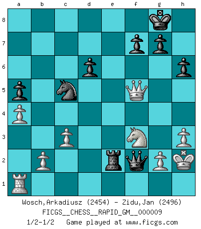 Last move : 1/2-1/2 2021 February 6 15:30:6 [Event "FICGS__CHESS__RAPID_GM__000009"] [Site "FICGS"] [Date "2020.10.01"] [Round "1"] [White "Wosch,Arkadiusz"] [Black "Zidu,Jan"] [Result "1/2-1/2"] [WhiteElo "2454"] [BlackElo "2496"] 1.e4 e5 2.Nf3 Nc6 3.Bc4 Nf6 4.d3 Bc5 5.c3 d6 6.O-O O-O 7.h3 a5 8.Re1 h6 9.Nbd2 Be6 10.Bb5 Qb8 11.Nf1 Qa7 12.Be3 Bxe3 13.Nxe3 Ne7 14.a4 Ng6 15.d4 c6 16.Bd3 Qb6 17.Bc4 exd4 18.Nxd4 Bxc4 19.Nxc4 Qc5 20.Nd2 Rfe8 21.Qb3 Nf4 22.N2f3 Re7 23.Nf5 Rxe4 24.Qxb7 Rae8 25.Rxe4 Nxe4 26.N5d4 Ne2+ 27.Nxe2 Qxf2+ 28.Kh2 Nc5 29.Qxc6 Rxe2 30.Qc8+ Kh7 31.Qf5+ Kg8 1/2-1/2 Follow this game move after move (download)The battle for the ultimate truth will never be won. And that's why Chess is so fascinating. (Hans Kmoch) Auf jeden Fall musst du zuerst Rechtsanwalt werden, damit du deine eigenen Interessen und die deiner Familie vertreten kannst. [Brief an seinen Sohn] (José Raúl Capablanca) El Ajedrez es una guerra en un tablero. El objetivo es aplastar la mente del oponente. (Bobby Fischer) Shah mat. Le roi est mort. Cri de fierté d'un joueur venant de terrasser son adversaire, courtoisement, sans effusion de sang. You must do what you feel is right... of course. (Obi-Wan Kenobi in Star Wars ep.4)