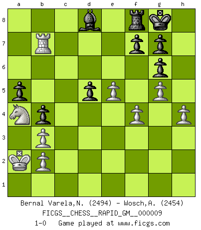 Last move : 1-0 2021 March 1 7:26:36 [Event "FICGS__CHESS__RAPID_GM__000009"] [Site "FICGS"] [Date "2020.10.01"] [Round "1"] [White "Bernal Varela,Nelson"] [Black "Wosch,Arkadiusz"] [Result "1-0"] [WhiteElo "2494"] [BlackElo "2454"] 1.Nf3 Nf6 2.d4 d5 3.c4 c6 4.e3 Bf5 5.Nc3 e6 6.Nh4 Be4 7.f3 Bg6 8.Bd2 dxc4 9.Bxc4 a6 10.Qe2 c5 11.dxc5 Bxc5 12.Nxg6 hxg6 13.O-O-O Nc6 14.g4 b5 15.Bb3 Na5 16.e4 Nxb3+ 17.axb3 Qb8 18.h4 Be7 19.Be3 b4 20.Na4 Qb5 21.Qh2 Nd7 22.g5 Nc5 23.Bxc5 Bxc5 24.Kb1 Be7 25.Qc7 Bd8 26.Qg3 Ra7 27.Rc1 a5 28.Ka2 Rd7 29.Qf2 Be7 30.f4 Qd3 31.Rc4 Qd6 32.Rc8+ Rd8 33.e5 Qd3 34.Rxd8+ Bxd8 35.Rc1 Qe4 36.Qa7 O-O 37.Qd7 Qf3 38.Rc8 Be7 39.Rc7 Bd8 40.Rc8 Be7 41.Rc1 Bd8 42.Rc4 Qg3 43.Rc8 Be7 44.Rc6 Qf3 45.Rb6 Bd8 46.Rb8 Qd5 47.Qxd5 exd5 48.Rb7 1-0 Follow this game move after move (download)My opponents make good moves too. Sometimes I don't take these things into consideration. (Bobby Fischer) Der Bart als Geschlechtszeichen mitten im Gesicht ist obszön. Daher gefällt er den Weibern. [Zugegeben, kein Schachzitat, aber unglaublich originell] (Arthur Schopenhauer) El juego de Damas es para vagabundos. (Paul Morphy) Tous ces prétendus hommes politiques sont les pions, les Cavaliers, les Tours ou les Fous d'une partie d'échecs qui se jouera tant qu'un hasard ne renversera pas l'échiquier. (Honoré de Balzac) I just play for fun. (Anna Kournikova)