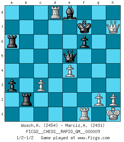 Last move : 1/2-1/2 2020 December 30 3:35:5 [Event "FICGS__CHESS__RAPID_GM__000009"] [Site "FICGS"] [Date "2020.10.01"] [Round "1"] [White "Wosch,Arkadiusz"] [Black "Marciz,Alexander"] [Result "1/2-1/2"] [WhiteElo "2454"] [BlackElo "2431"] 1.e4 c5 2.Nf3 Nc6 3.d4 cxd4 4.Nxd4 Nf6 5.Nc3 e5 6.Ndb5 d6 7.Bg5 a6 8.Na3 b5 9.Nd5 Be7 10.Bxf6 Bxf6 11.c3 Rb8 12.Nc2 Bg5 13.a4 bxa4 14.Ncb4 Nxb4 15.Nxb4 Bd7 16.Bxa6 Qa5 17.Qxd6 Rb6 18.Qd3 Be7 19.Nd5 Rxb2 20.O-O Qc5 21.Rad1 Bc6 22.Nxe7 Kxe7 23.Qg3 Ra8 24.Qxg7 Rxa6 25.Qg5+ Ke6 26.Qh6+ Ke7 27.Qh4+ Ke6 28.Qxh7 a3 29.Qh4 Qc4 30.f4 f6 31.fxe5 Qc5+ 32.Kh1 Qxe5 33.Qh3+ Ke7 34.Qh7+ Kf8 35.Rd8+ Be8 36.Qh8+ Kf7 37.Qh7+ Kf8 38.Qh8+ Kf7 39.Qh7+ 1/2-1/2 Follow this game move after move (download)Pawns are born free, yet they are everywhere in chains. (Rick Kennedy) Dass jemand wie Surab Asmaiparaschwili, der selbst Elopunkte gekauft hat , Vize-Präsident der Fide werden konnte, sagt schon einges über den Zustand dieser Organisation aus. (Joel Lautier) Entre mas años cumplo, mas valoro los Peones. (Keres) Roi des jeux et jeu des rois, les échecs portent en eux un sentiment d'infini. Ils donnent à celui qui s'est efforcé d'en approfondir les arcanes l'impression de n'être pas à la mesure de l'homme; en fait, ils constituent un résumé de l'univers, un microcosme, et figurent cette grande échelle qui, dans les plans de la lumière descend jusqu'à la matière, qui des abîmes insondables remonte jusqu'en l'infini de Dieu. (Pyrame) Have no fear of perfection - you'll never reach it. (Salvador Dali)