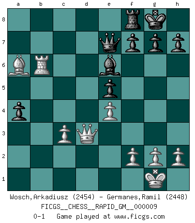 Last move : 0-1 2020 December 31 20:44:19 [Event "FICGS__CHESS__RAPID_GM__000009"] [Site "FICGS"] [Date "2020.10.01"] [Round "1"] [White "Wosch,Arkadiusz"] [Black "Germanes,Ramil"] [Result "0-1"] [WhiteElo "2454"] [BlackElo "2448"] 1.e4 c5 2.Nf3 Nc6 3.d4 cxd4 4.Nxd4 Nf6 5.Nc3 e5 6.Ndb5 d6 7.Bg5 a6 8.Na3 b5 9.Nd5 Be7 10.Bxf6 Bxf6 11.c3 Rb8 12.Nc2 Bg5 13.a4 bxa4 14.Ncb4 Nxb4 15.Nxb4 Bd7 16.Bxa6 Qa5 17.Qxd6 Rb6 18.Qd3 Be7 19.Nd5 Rxb2 20.O-O Qc5 21.Rab1 Rxb1 22.Rxb1 O-O 23.Nxe7+ Qxe7 24.Rb6 Be6 0-1 Follow this game move after move (download)For surely of all the drugs in the world, Chess must be the most permanently pleasurable. (Assiac) Zum Sieg gelangt man nicht, wenn man gut, sondern nur wenn man besser spielt (Savielly Grigorievitsch Tartakower) Un jugador que trata de regresar una movida en el Ajedrez es un futuro carterista. (Richard Fenton) Votre seul travail dans les ouvertures est d'obtenir un milieu de partie jouable. (Lajos Portish) There is a computer disease that anybody who works with computers knows about. It's a very serious disease and it interferes completely with the work. The trouble with computers is that you 'play' with them ! (Richard P. Feynman)