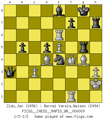 Last move : 1/2-1/2 2021 January 20 5:2:24 [Event "FICGS__CHESS__RAPID_GM__000009"] [Site "FICGS"] [Date "2020.10.01"] [Round "1"] [White "Zidu,Jan"] [Black "Bernal Varela,Nelson"] [Result "1/2-1/2"] [WhiteElo "2496"] [BlackElo "2494"] 1.e4 e6 2.d4 d5 3.Nc3 Nf6 4.e5 Nfd7 5.f4 c5 6.Nf3 cxd4 7.Nxd4 Nc6 8.Be3 Qb6 9.a3 Bc5 10.Ncb5 a6 11.b4 axb5 12.bxc5 Qxc5 13.Qd3 Nxd4 14.Bxd4 Qc7 15.Qe3 O-O 16.Bd3 b6 17.O-O Nc5 18.Rf3 Qe7 19.Rc1 Bd7 20.Rg3 g6 21.Rh3 h5 22.g4 hxg4 23.Rh6 Kg7 24.f5 gxf5 25.Bxf5 Rh8 26.Rf6 Rag8 27.Rf1 Rh3 28.Qf4 Be8 29.Bxg4 Kf8 30.Kg2 Rh5 31.h3 Ne4 32.Bxb6 R8g5 33.c3 Rh7 34.Bd4 Kg8 35.Kh2 Qxa3 36.Rxe6 1/2-1/2 Follow this game move after move (download)I won't play with you anymore. You have insulted my friend. - When an opponent cursed himself for a blunder. (Miguel Najdorf) Das Zentrum ist der Balkan des Schachbretts - Kriegshandlungen können in jedem Moment ausbrechen. (Aaron Nimzowitsch) Aún el Rey más flojo huye despavorido ante la amenaza de un Jaque doble. (Aaron Nimzowitsch) Vous m'avez demandé de vous exposer quel est le fondement de la prière. Je ne fais que préparer les pièces du jeu sur la table... Nous sera-t-il permis d'en adopter les règles et si nous les appliquons scrupuleusement nous ne tarderons pas à faire mat le Roi divin ! Il ne pourra échapper à nos mains. (Sainte Thérèse d'Avila, Chemin de perfection) Just because you do not take an interest in politics doesn't mean politics won't take an interest in you. (Pericles 430 B.C.)