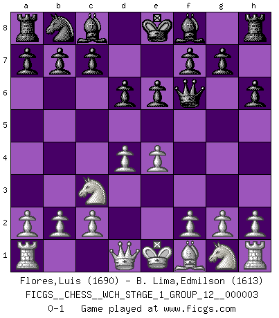 Last move : 0-1 2007 August 21 4:47:44 [Event "FICGS__CHESS__WCH_STAGE_1_GROUP_12__000003"] [Site "FICGS"] [Date "2007.07.11"] [Round "1"] [White "Flores,Luis"] [Black "B. Lima,Edmilson"] [Result "0-1"] [WhiteElo "1690"] [BlackElo "1613"] 1.d4 Nf6 2.Bg5 e6 3.e4 h6 4.Bxf6 Qxf6 5.Nc3 d6 0-1 This chess game has been lost on time (started : 2007.07.11 17:7:55) Trompowsky attack (Ruth, Opovcensky Opening) Player Black won this chess game. Follow this game move after move (download)The beauty of a move lies not in its' appearance but in the thought behind it. (Siegbert Tarrasch) Die starken Figuren des Gegners muss man abtauschen. (José Raúl Capablanca) Ciertamente el estado mental actual de Bobby Fischer es una tragedia. Uno de los mas grandes jugadores de Ajedrez del mundo -el orgullo y pena del Ajedrez Americano. (Frank Brady) Dieu déplace le joueur, et celui-ci la pièce. Quel Dieu derrière Dieu commence donc la trame ? Arturo Perez-Reverte (prix de littérature policière 1993). What doesn't kill us makes us stronger. (Friedrich Nietzsche)