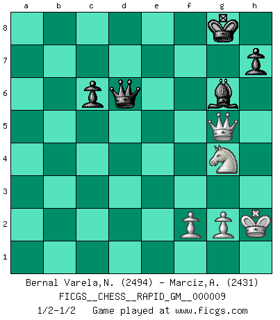 Last move : 1/2-1/2 2020 December 18 7:12:59 [Event "FICGS__CHESS__RAPID_GM__000009"] [Site "FICGS"] [Date "2020.10.01"] [Round "1"] [White "Bernal Varela,Nelson"] [Black "Marciz,Alexander"] [Result "1/2-1/2"] [WhiteElo "2494"] [BlackElo "2431"] 1.Nf3 c5 2.e4 Nc6 3.Bb5 g6 4.O-O Bg7 5.Bxc6 bxc6 6.Re1 Nh6 7.c3 O-O 8.d4 cxd4 9.cxd4 d5 10.e5 f6 11.exf6 exf6 12.Nbd2 Re8 13.Nb3 Nf7 14.h3 Bf5 15.Rxe8+ Qxe8 16.Bd2 g5 17.a3 Nd6 18.Nc5 Nc4 19.Bc3 Rb8 20.Qa4 Nxb2 21.Qxa7 Nc4 22.Qa4 Bf8 23.Bb4 Qc8 24.Qd1 Bg6 25.Qc1 Bxc5 26.Bxc5 Qe6 27.Nd2 Nb2 28.a4 Nd3 29.Qd1 Qf5 30.Qf3 Nxc5 31.dxc5 Qc2 32.Nf1 Qb2 33.Re1 Rb4 34.a5 Ra4 35.h4 Rxh4 36.Re6 Rf4 37.Qe3 Qb5 38.Re7 Bf7 39.Rd7 Re4 40.Qc3 d4 41.Rxd4 Rxd4 42.Qxd4 Qxa5 43.Qxf6 Qxc5 44.Ne3 Bh5 45.Kh2 Bg6 46.Ng4 Qf8 47.Qxg5 Qd6+ 1/2-1/2 Follow this game move after move (download)Botvinnik tried to take the mystery out of Chess, always relating it to situations in ordinary life. He used to call Chess a typical inexact problem similar to those which people are always having to solve in everyday life. (Garry Kasparov) Über Karpov: Er war und ist ein Vertreter der russischen Reaktionäre. Das steckt tief in seiner Seele, wehalb ich nicht nett mit ihm umgehen kann. (Viktor Kortschnoi) ¿Porque tengo que perder ante este idiota?. (Aron Nimzovich) Le pion, dans sa simplicité, marche droit devant lui, mais lorsqu'il prend, il le fait obliquement? Ainsi l'homme, tant qu'il reste pauvre, marche dans la droiture et vit honnêtement, mais lorsqu'il recherche les honneurs, il flatte, se parjure et, par les voies obliques, cherche une position supérieure sur l'échiquier du monde. (Jean de Galles) We're missing something. (Gregory House, House M.D.)