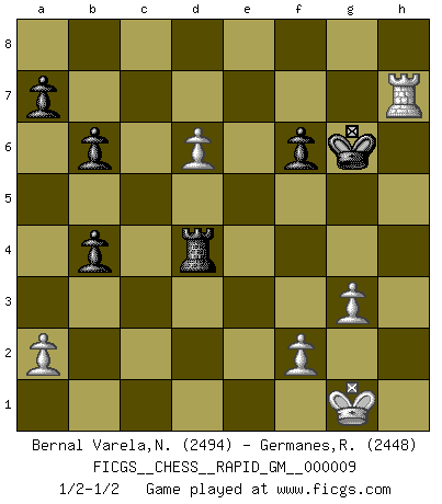 Last move : 1/2-1/2 2021 January 27 15:40:32 [Event "FICGS__CHESS__RAPID_GM__000009"] [Site "FICGS"] [Date "2020.10.01"] [Round "1"] [White "Bernal Varela,Nelson"] [Black "Germanes,Ramil"] [Result "1/2-1/2"] [WhiteElo "2494"] [BlackElo "2448"] 1.Nf3 d5 2.d4 Nf6 3.c4 c6 4.e3 e6 5.b3 b6 6.Bd3 Bd6 7.Bb2 Nbd7 8.O-O Bb7 9.Nbd2 O-O 10.Qe2 Qe7 11.Rad1 Rad8 12.e4 dxe4 13.Nxe4 Nxe4 14.Qxe4 f5 15.Qe3 c5 16.Ng5 e5 17.d5 f4 18.Qh3 Qxg5 19.Qe6+ Rf7 20.Qxd6 f3 21.g3 Re8 22.Rfe1 Rfe7 23.h4 Qh5 24.b4 cxb4 25.Bf1 Nc5 26.Bh3 Qf7 27.Rxe5 Rxe5 28.Bxe5 Bc8 29.Bxc8 Rxc8 30.Bd4 Qd7 31.Qf4 Rf8 32.Qg5 Ne4 33.Qe5 Re8 34.Qh5 Qf7 35.Qxf7+ Kxf7 36.Rd3 Rc8 37.Rxf3+ Nf6 38.Bxf6 gxf6 39.Re3 Rxc4 40.d6 Rd4 41.Re7+ Kg6 42.h5+ Kxh5 43.Rxh7+ Kg6 1/2-1/2 Follow this game move after move (download)Up to this point White has been following well-known analysis. But now he makes a fatal error: he begins to use his own head. (Siegbert Tarrasch) Es gibt Leute, die glauben, alles wäre vernünftig, was man mit einem ernsthaften Gesicht tut. (Georg Christoph Lichtenberg) El Ajedrez es una manera fabulosa para que los niños aprendan a autovalorarse y a autoestimarse. (Saudin Robovic) Les Cavaliers se révèlent fort utiles dans les positions fermées. D'habitude, les Fous sont un peu plus forts que les Cavaliers dans les positions ouvertes. Qu'on le veuille ou non, il restera toujours des exceptions ! Logic : The art of thinking and reasoning in strict accordance with the limitations and incapacities of the human misunderstanding. (Ambrose Bierce)