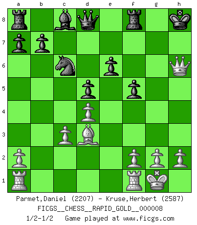 Last move : 1/2-1/2 2020 October 22 21:2:38 [Event "FICGS__CHESS__RAPID_GOLD__000008"] [Site "FICGS"] [Date "2020.10.04"] [Round "2"] [White "Parmet,Daniel"] [Black "Kruse,Herbert"] [Result "1/2-1/2"] [WhiteElo "2207"] [BlackElo "2587"] 1.d4 Nf6 2.c4 e6 3.Nf3 d5 4.Nc3 dxc4 5.e4 Bb4 6.Bxc4 Nxe4 7.O-O Nxc3 8.bxc3 Bd6 9.Ng5 h6 10.Ne4 O-O 11.Qh5 f5 12.Nxd6 cxd6 13.Bf4 d5 14.Bd3 Nc6 15.Bxh6 gxh6 16.Qg6+ Kh8 17.Qxh6+ Kg8 18.Qg6+ Kh8 19.Qh6+ Kg8 20.Qg6+ Kh8 21.Qh6+ 1/2-1/2 Queen's pawn game Kingside Castling by player White (move 7) Kingside Castling by player Black (move 10) This chess game ended in a draw. Follow this game move after move (download)Though most people love to look at the games of the great attacking masters, some of the most successful players in history have been the quiet positional players. They slowly grind you down by taking away your space, tying up your pieces, and leaving you with virtually nothing to do ! (Yasser Seirawan) Sitze auf Deine Hände. (Siegbert Tarrasch) Un Peón pasado aumenta su poder a medida de que el número de piezas en el tablero disminuye. (Capablanca) Aux échecs, l'amour-propre est satisfait quand on remporte la victoire, mais il n'y a pas de honte à être battu. (Benjamin Franklin) The man who strikes first admits that his ideas have given out. (Chinese proverb)
