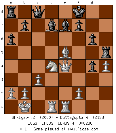 Last move : 0-1 2021 June 6 2:4:36 [Event "FICGS__CHESS__CLASS_A__000238"] [Site "FICGS"] [Date "2020.10.06"] [Round "1"] [White "Shklyaev,Sergei"] [Black "Duttagupta,Aniruddha"] [Result "0-1"] [WhiteElo "2000"] [BlackElo "2138"] 1.e4 c5 2.Nf3 d6 3.d4 cxd4 4.Nxd4 Nf6 5.Nc3 a6 6.Be3 e6 7.Be2 Be7 8.g4 h6 9.h4 d5 10.exd5 Nxd5 11.Nxd5 Qxd5 12.Bf3 Qa5+ 13.c3 Nd7 14.g5 Ne5 15.Qe2 Qc7 16.O-O-O Bd7 17.Kb1 Nxf3 18.Qxf3 g6 19.Bf4 e5 20.Bg3 hxg5 21.Rhe1 g4 22.Qd5 Rh5 23.Bxe5 Kf8 24.Qe4 Qc8 0-1 Follow this game move after move (download)We like to think. (Gary Kasparov) Im Blitz ist es einfacher mit einer Figur weniger anzugreifen, als sich mit einer Mehrfigur zu verteidigen. (Mikhail Nekhemyevich Tal) El Ajedrez, como cualquier otra actividad creativa, puede existir solo a través de méritos combinados de aquellos que tienen talento creativo y de aquellos que tienen la habilidad de organizar un trabajo creativo. (Mikhail Botvinnik) Le plus grand jeu de l'esprit jamais inventé, plus vous l'apprenez, plus vous y prenez du plaisir. (Garry Kasparov) War is the child of passion, passion is the child of narcissism and narcissism is the child. (...) Another game ? (Thibault de Vassal)