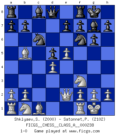 Last move : 1-0 2020 December 14 1:55:7 [Event "FICGS__CHESS__CLASS_A__000238"] [Site "FICGS"] [Date "2020.10.06"] [Round "1"] [White "Shklyaev,Sergei"] [Black "Satonnet,Patrick"] [Result "1-0"] [WhiteElo "2000"] [BlackElo "2102"] 1.e4 c5 2.Nf3 Nc6 3.Bb5 g6 4.c3 Nf6 5.Qe2 Bg7 6.O-O O-O 7.d4 cxd4 8.cxd4 d5 9.e5 1-0 This chess game has been lost on time (started : 2020.10.06 22:4:47) Follow this game move after move (download)The game of chess is the touchstone of the intellect. (Goethe) Obwohl ich alt bin, darf mir niemand den Finger in den Mund stecken, sonst beisse ich. (Wilhelm Steinitz) Aquel que toma al Peón de Caballo de la Reina, se pasará la noche a dormir en la calle. (Anónimo) L'attaque fait le spectacle, la défense gagne les matchs. (Dicton footballistique) There are more things in heaven and earth than practically anywhere else. (Unknown)
