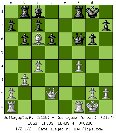 Last move : 1/2-1/2 2021 March 24 21:36:46 [Event "FICGS__CHESS__CLASS_A__000238"] [Site "FICGS"] [Date "2020.10.06"] [Round "1"] [White "Duttagupta,Aniruddha"] [Black "Rodriguez Perez,Rene"] [Result "1/2-1/2"] [WhiteElo "2138"] [BlackElo "2167"] 1.d4 Nf6 2.c4 g6 3.f3 Nc6 4.d5 Ne5 5.e4 d6 6.f4 Ned7 7.Nc3 Bg7 8.Nh3 Nc5 9.Nf2 O-O 10.Be3 e6 11.dxe6 Bxe6 12.Be2 Qe7 13.Bd4 Bc8 14.Bf3 Nfxe4 15.Nfxe4 Nxe4 16.Nxe4 Bxd4 17.Qxd4 f5 18.O-O fxe4 19.Bxe4 Qf6 20.Qd2 Rb8 21.b3 b6 22.Bc6 1/2-1/2 Follow this game move after move (download)I prefer to lose a really good game than to win a bad one. (David Levy) Nur ein wirklich starker Spieler weiß wie schwach er spielt. (Savielly Grigorievitsch Tartakower) El Ajedrez es parte de la cultura, y si una cultura esta en decadencia, entonces también el Ajedrez declinará. (Mikhail Botvinnik) Les Echecs sont affaire de jugement sensible. Savoir quand frapper et quand esquiver. (Fischer) The production of too many useful things results in too many useless people. (Karl Marx)