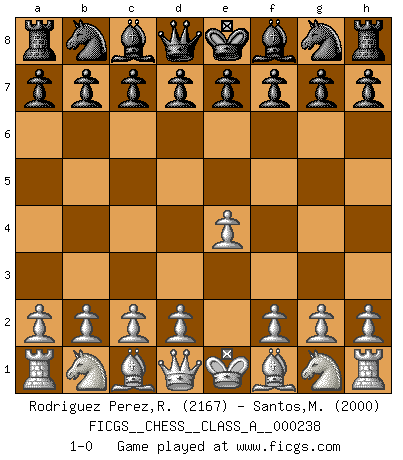 Last move : 1-0 2020 November 16 11:2:19 [Event "FICGS__CHESS__CLASS_A__000238"] [Site "FICGS"] [Date "2020.10.06"] [Round "1"] [White "Rodriguez Perez,Rene"] [Black "Santos,Matheus"] [Result "1-0"] [WhiteElo "2167"] [BlackElo "2000"] 1.e4 1-0 This chess game has been lost on time (started : 2020.10.06 22:4:47) Follow this game move after move (download)In Chess, just as in life, today's bliss may be tomorrow's poison. (Assaic) In der Schule lernt man nichts. Es ist nur Zeitverschwendung. (Robert James Fischer) Un mal plan es mejor que no tener ningún plan. (Frank Marshall) Même un GMI sait rarement calculer sur plus de cinq coups une attaque à sacrifices. (Rudolf Spielmann) This is where the fun begins. (Anakin Skywalker in Star Wars ep.3)