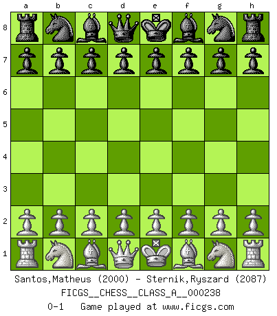 Last move : 0-1 2020 November 16 11:2:19 [Event "FICGS__CHESS__CLASS_A__000238"] [Site "FICGS"] [Date "2020.10.06"] [Round "1"] [White "Santos,Matheus"] [Black "Sternik,Ryszard"] [Result "0-1"] [WhiteElo "2000"] [BlackElo "2087"] 0-1 This chess game has been lost on time (started : 2020.10.06 22:4:47) Follow this game move after move (download)I have always a slight feeling of pity for the man who has no knowledge of Chess. (Siegbert Tarrasch) Obendrein hat der FIDE-Präsident den Revolutionsführer Gaddafi zum »Großmeister« ernannt, am Ende der WM. Das ist lächerlich! (Joel Lautier) Botvinnik trató de alejar el misterio referente al Ajedrez, siempre relacionandolo a situaciones de la vida diaria. Solía llamar al Ajedrez un problema inexacto típico, similar a aquellos en que la gente tiene siempre que resolver a cada día. (Garry Kasparov) Psychologiquement, tu dois avoir confiance en toi même, mais cette confiance doit être basée sur des faits. (Robert Fischer) To be champion requires more than simply being a strong player; one has to be a strong human being as well. (Anatoly Karpov)