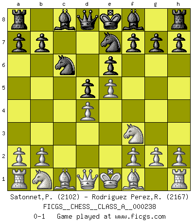 Last move : 0-1 2020 December 24 12:5:42 [Event "FICGS__CHESS__CLASS_A__000238"] [Site "FICGS"] [Date "2020.10.06"] [Round "1"] [White "Satonnet,Patrick"] [Black "Rodriguez Perez,Rene"] [Result "0-1"] [WhiteElo "2102"] [BlackElo "2167"] 1.e4 e6 2.d4 d5 3.e5 c5 4.c3 Nc6 5.Nf3 cxd4 6.cxd4 Nge7 0-1 This chess game has been lost on time (started : 2020.10.06 22:4:47) Follow this game move after move (download)Who is your opponent tonight, tonight I am playing against the Black pieces. (Akiba Rubinstein) Fallen sollten polizeilich verboten werden. (Savielly Grigorievitsch Tartakower) En partidas rápidas, el Caballo es mas poderoso que el Alfil. (Vlastimil Hort) On croit qu'il y a plus de mauvais joueurs que de bons joueurs, c'est faux : Il y a autant de joueurs qui gagnent que de joueurs qui perdent. (Philippe Geluck) Opportunities multiply as they are seized. (Sun Tzu)