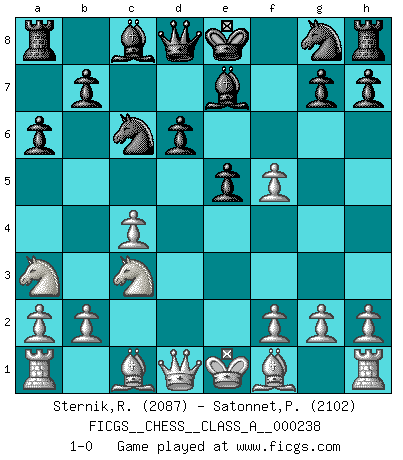 Last move : 1-0 2020 December 16 2:10:17 [Event "FICGS__CHESS__CLASS_A__000238"] [Site "FICGS"] [Date "2020.10.06"] [Round "1"] [White "Sternik,Ryszard"] [Black "Satonnet,Patrick"] [Result "1-0"] [WhiteElo "2087"] [BlackElo "2102"] 1.e4 c5 2.Nf3 Nc6 3.d4 cxd4 4.Nxd4 e5 5.Nb5 d6 6.c4 Be7 7.N1c3 a6 8.Na3 f5 9.exf5 1-0 This chess game has been lost on time (started : 2020.10.06 22:4:47) Follow this game move after move (download)I thought the most common mistake [in chess] was the first one: Learning the game :P (Garvin Gray, FICGS forum) Wie, soll nun auch die Opposition abgeschafft werden? Ja, es tut mir leid, Ihnen diesen Schmerz nicht ersparen zu können. (Aaron Nimzowitsch) Cuando tu casa esta en llamas, no puedes ser molestado por tus vecinos. O, como decinos en Ajedrez, si tu Rey esta bajo ataque, no te preocupa perder un Peón del lado de la Reina. (Gary Kasparov) J'ai vu le vaincu d'Echecs jouer des années durant dans l'espoir de la fête de la victoire. Car tu es plus riche de ce qu'elle existe si même elle n'est point pour toi. Ainsi de la perle du fond des mers. (Antoine de Saint-Exupéry) Man is still the most extraordinary computer of all. (John F. Kennedy)
