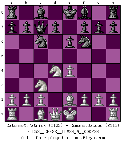 Last move : 0-1 2020 December 22 22:44:6 [Event "FICGS__CHESS__CLASS_A__000238"] [Site "FICGS"] [Date "2020.10.06"] [Round "1"] [White "Satonnet,Patrick"] [Black "Romano,Jacopo"] [Result "0-1"] [WhiteElo "2102"] [BlackElo "2115"] 1.e4 c5 2.Nf3 e6 3.d4 cxd4 4.Nxd4 Nc6 5.Nc3 Qc7 6.Be2 Nf6 0-1 This chess game has been lost on time (started : 2020.10.06 22:4:47) Follow this game move after move (download)By this measure (on the gap between Fischer & his contemporaries), I consider him the greatest world champion. (Garry Kasparov) Ein Remis kann durch Wiederholung von drei Zügen oder durch einen schlechte Zug erreicht werden. (Savielly Grigorievitsch Tartakower) Yo tuve un dolor de muelas en la primer partida. En el segundo juego, tuve un dolor de cabeza. En el tercero, tuve un ataque de reumatísmo. En la cuarta partida, no me sentía muy bien. ¿Y en el quinto juego? Bueno, ¿que acaso uno tiene que ganar todos los juegos?. (Siegbert Tarrasch) On a dit que l'homme se distingue de l'animal par le fait qu'il achète plus de livres qu'il ne peut en lire. Je voudrais suggérer qu'inclure à la liste des livres quelques livres d'échecs rendrait la distinction manifeste. (Edward Lasker) Follow your passion, and success will follow you. (Arthur Buddhold)