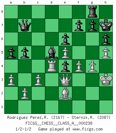Last move : 1/2-1/2 2021 January 1 18:27:28 [Event "FICGS__CHESS__CLASS_A__000238"] [Site "FICGS"] [Date "2020.10.06"] [Round "1"] [White "Rodriguez Perez,Rene"] [Black "Sternik,Ryszard"] [Result "1/2-1/2"] [WhiteElo "2167"] [BlackElo "2087"] 1.e4 c5 2.Nf3 e6 3.d4 cxd4 4.Nxd4 Nc6 5.Nc3 a6 6.Be3 Nf6 7.Be2 Qc7 8.O-O Be7 9.f4 d6 10.Qe1 O-O 11.Qg3 Nxd4 12.Bxd4 b5 13.a3 Bb7 14.Rae1 d5 15.e5 Bc5 16.Qe3 Bxd4 17.Qxd4 Ne4 18.Nxe4 dxe4 19.c3 Rfd8 20.Qe3 Rac8 21.Rd1 Rd5 22.Rxd5 Bxd5 23.Rd1 Qb7 24.h4 h6 25.g3 Kh7 26.Kf2 a5 27.Rd4 Rf8 28.h5 Rc8 29.g4 Rf8 30.Kg3 Qc6 31.Kf2 Qb7 32.Kg3 Qc6 33.Kg2 Qb7 34.Rd1 Rc8 35.Rd4 Rf8 36.Kh3 Rg8 1/2-1/2 Follow this game move after move (download)The defensive power of a pinned piece is only imaginary. (Aaron Nimzovich) Je mehr wir mit Computern analysieren, desto mehr glauben wir an Verteidigung. (Vladimir Kramnik) Personalmente, yo prefiero mirar hacia el futuro en donde un programa de computadora gane el título mundial de Ajedrez. La humanidad necesita una lección de humildad. (Richard Dawkings) Les Echecs mettent en conflit, non pas deux intelligences, mais deux volontés. (Lasker) Memory is a crazy woman that hoards colored rags and throws away food. (Austin O'Malley)