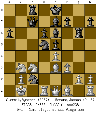 Last move : 0-1 2020 November 6 21:44:48 [Event "FICGS__CHESS__CLASS_A__000238"] [Site "FICGS"] [Date "2020.10.06"] [Round "1"] [White "Sternik,Ryszard"] [Black "Romano,Jacopo"] [Result "0-1"] [WhiteElo "2087"] [BlackElo "2115"] 1.e4 c5 2.Nf3 e6 3.d4 cxd4 4.Nxd4 Nc6 5.Nc3 Qc7 6.Be3 a6 7.Qf3 d6 8.O-O-O Bd7 9.Qg3 Nf6 10.Kb1 Be7 11.Qxg7 Rg8 12.Qh6 Rg6 13.Qh4 Rc8 14.Nf3 e5 15.a3 b5 16.Nd2 Be6 17.f3 b4 18.axb4 Nxb4 19.Nb3 Nfd5 20.Qe1 Nxc2 0-1 Follow this game move after move (download)Look at Garry Kasparov. After he loses, invariably he wins the next game. He just kills the next guy. That's something that we have to learn to be able to do. (Maurice Ashley) Deine Wertungszahl - vorausgesetzt einige Jahre schachliche Anstrengung - entspricht etwa dem zehnfachen Deines IQ plus 1000. (Jonathan Levitt) Por tratar de evitar la pérdida de una pieza, muchas personas han perdido una partida de Ajedrez. (Savielly Tartakover) C'est une question de caractère, Beaucoup de gens perdent leur motivation très vite. D'autres, ils sont rares, peuvent la conserver très longtemps. J'aime les échecs, encore aujourd'hui je suis heureux d'analyser des parties. J'aime toujours gagner, je déteste encore perdre. Bien jouer est important pour mon intégrité intellectuelle et morale. Et puis les échecs vivent en ce moment une période historique grâce à Internet. Ils se développent dans les systèmes éducatifs à travers le monde. Ils sortent de leur ghetto, et c'est mon rôle de mener à bien cette révolution. (Gary Kasparov) Life is pleasant. Death is peaceful. It's the transition that's troublesome. (Isaac Asimov)