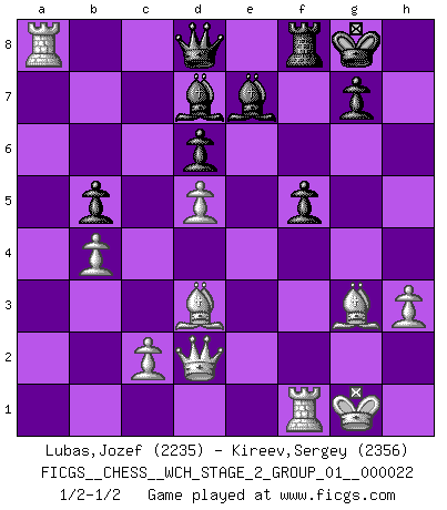 Last move : 1/2-1/2 2020 November 21 8:3:43 [Event "FICGS__CHESS__WCH_STAGE_2_GROUP_01__000022"] [Site "FICGS"] [Date "2020.10.07"] [Round "1"] [White "Lubas,Jozef"] [Black "Kireev,Sergey"] [Result "1/2-1/2"] [WhiteElo "2235"] [BlackElo "2356"] 1.e4 c5 2.Nf3 d6 3.d4 cxd4 4.Nxd4 Nf6 5.Nc3 a6 6.h3 e5 7.Nde2 h5 8.g3 Be7 9.Bg2 b5 10.Nd5 Nxd5 11.Qxd5 Ra7 12.Be3 Rb7 13.a3 O-O 14.O-O Nd7 15.Qd2 Nf6 16.Nc3 a5 17.b4 Be6 18.Nd5 axb4 19.axb4 Nxd5 20.exd5 Bd7 21.Ra6 h4 22.f4 exf4 23.Bxf4 hxg3 24.Bxg3 Rb6 25.Ra7 Rb8 26.Be4 f5 27.Bd3 Ra8 28.Rxa8 1/2-1/2 Follow this game move after move (download)A good sacrifice is one that is not necessarily sound but leaves your opponent dazed and confused. (Rudolph Spielmann) Ihnen, Herr Lasker, habe ich nur drei Worte zu sagen: Schach und matt. (Siegbert Tarrasch) El sobresalir en el Ajedrez es un signo de una mente intrigante. (Sir Arthur Conan Doyle) Les échecs sont utiles à l'exercice de la faculté de penser et à celle de l'imagination. Car nous devons posséder une méthode élaborée pour atteindre des buts partout où nous devons conduire notre raison. (Leibnitz) It is not true that people stop pursuing dreams because they grow old, they grow old because they stop pursuing dreams. (Gabriel Garcia Marquez)