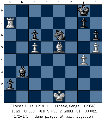 Last move : 1/2-1/2 2020 December 11 6:17:48 [Event "FICGS__CHESS__WCH_STAGE_2_GROUP_01__000022"] [Site "FICGS"] [Date "2020.10.07"] [Round "1"] [White "Flores,Luis"] [Black "Kireev,Sergey"] [Result "1/2-1/2"] [WhiteElo "2141"] [BlackElo "2356"] 1.d4 d5 2.Nf3 Nf6 3.c4 c6 4.Nc3 e6 5.g3 dxc4 6.Bg2 Nbd7 7.O-O b5 8.e4 Bb7 9.e5 Nd5 10.Ng5 h6 11.Nge4 Be7 12.Qh5 Kf8 13.Rd1 a6 14.h4 Kg8 15.Qe2 Qa5 16.h5 Rc8 17.Bf4 Rd8 18.Rac1 b4 19.Nb1 Qxa2 20.Rxc4 a5 21.Rc2 Nb8 22.Qe1 Ba6 23.Nc5 Bxc5 24.dxc5 Qa4 25.Be4 Qb5 26.Be3 Nd7 27.f4 f6 28.exf6 N7xf6 29.Bd4 Nxe4 30.Qxe4 Qb7 31.Be5 Qf7 32.g4 Rf8 33.Bd6 Nf6 34.Qg2 Re8 35.Nd2 Nd5 36.Qe4 Bb5 37.Re1 e5 38.fxe5 Qf4 39.Qf3 a4 40.e6 Qd4+ 41.Kh1 Qf6 42.Qg3 Rxe6 43.Ne4 Qd4 44.Rd2 Qc4 45.Qf2 Rxe4 46.Qf8+ Kh7 47.Qf5+ Kg8 48.Qxe4 Qxe4+ 49.Rxe4 Kh7 50.Rf2 Ra8 51.Be5 Bd3 52.Re1 Kg8 53.Kg2 Re8 54.Rf3 Bb5 55.Kf2 Bc4 56.Bf4 Rxe1 57.Kxe1 Nf6 58.Bd2 Nd5 59.Be3 a3 60.bxa3 bxa3 61.Bd4 a2 62.Ra3 Nf4 63.Ra7 Ne6 64.Bc3 Bb3 65.Be5 1/2-1/2 Follow this game move after move (download)Suddenly it was obvious to me in my analysis I had missed what Fischer had found with the greatest of ease at the board. (Mikhail Botvinnik) Es hat in meinem Leben Zeiten gegeben, in denen das Schachspiel, wenn nicht zum Lebenszweck, so doch zu einem regelrechten Lebensersatz geworden ist. Man fühlt sich in solchen Zeiten nicht so, als besäße man eine göttliche Gabe, sondern eher so, als sei man von ihr besessen. (Garry Kasparov) Una victoria por una combinación errónea, aunque sea espectacular, me llena de horror artístico. (Wilhelm Steinitz) La tactique est l'élément le plus important du milieu de jeu. (Siegbert Tarrasch) The best weapon against an enemy is another enemy. (Friedrich Nietzsche)