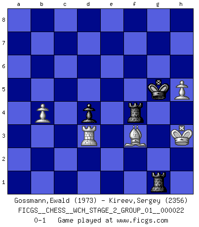 Last move : 0-1 2020 December 14 21:18:39 [Event "FICGS__CHESS__WCH_STAGE_2_GROUP_01__000022"] [Site "FICGS"] [Date "2020.10.07"] [Round "1"] [White "Gossmann,Ewald"] [Black "Kireev,Sergey"] [Result "0-1"] [WhiteElo "1973"] [BlackElo "2356"] 1.e4 c5 2.Nf3 d6 3.d4 cxd4 4.Nxd4 Nf6 5.Nc3 a6 6.h3 e5 7.Nde2 h5 8.Bg5 Be6 9.g3 Be7 10.Bg2 b5 11.O-O Nbd7 12.Re1 Qc7 13.Qd2 O-O 14.Nc1 Rac8 15.Nd3 Nb6 16.Qe2 Rfe8 17.Bxf6 Bxf6 18.Qxh5 Qd7 19.Nb4 g6 20.Qe2 a5 21.Nbd5 Nxd5 22.Nxd5 Bxd5 23.exd5 b4 24.a3 e4 25.axb4 axb4 26.Ra2 Bg7 27.b3 f5 28.Qe3 Qd8 29.Re2 Rc3 30.Qf4 Bd4 31.g4 Qf6 32.Ra4 e3 33.Kf1 Bc5 34.gxf5 Kg7 35.Ra6 Qxf5 36.Qxf5 gxf5 37.Bf3 Rd8 38.fxe3 Bxe3 39.Kg2 Kh6 40.Ra1 Bd4 41.Rf1 Rg8+ 42.Kh1 Rg3 43.Bg2 Kg5 44.Re8 Be5 45.Rf2 f4 46.Rg8+ Kh4 47.Rf8 Rge3 48.R8xf4+ Bxf4 49.Rxf4+ Kg5 50.Rf2 Re5 51.Bf1 Rce3 52.Kg2 Rf5 53.h4+ Kf6 54.h5 R3e5 55.Be2 Rxd5 56.Bf3 Rd4 57.Re2 Rg5+ 58.Kh3 Rf4 59.Re3 d5 60.c3 bxc3 61.Rxc3 d4 62.Rd3 Rg1 63.b4 Kg5 0-1 Follow this game move after move (download)Life is like a game of Chess, changing with each move. (Chinese proverb) Darum geht es im Schach. Einen Tag gibst du deinem Gegner eine Lektion, am nächsten Tag gibt er dir eine. (Robert James Fischer) Bobby es la celebridad menos entendida y malinterpretada que camina el la faz de esta tierra. (Yasser Seirawan) Le moment que je préfère le plus dans une rencontre, c'est celui où je sens que la personnalité de l'adversaire se brise. (Robert Fischer) A mistake is only a mistake if you let it happen twice. Otherwise it is a learning experience. (Daniel Parmet)