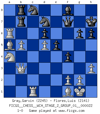 Last move : 1-0 2020 December 31 22:16:0 [Event "FICGS__CHESS__WCH_STAGE_2_GROUP_01__000022"] [Site "FICGS"] [Date "2020.10.07"] [Round "1"] [White "Gray,Garvin"] [Black "Flores,Luis"] [Result "1-0"] [WhiteElo "2245"] [BlackElo "2141"] 1.e4 c5 2.Nf3 d6 3.d4 cxd4 4.Nxd4 Nf6 5.Nc3 a6 6.Be2 e5 7.Nb3 Be7 8.Be3 Be6 9.O-O Nbd7 10.a4 O-O 11.a5 Rc8 12.Bf3 Rc4 13.Nd2 Rb4 14.b3 Qc7 15.Ndb1 Rc8 16.Ra2 h6 17.Re1 Qd8 18.Nd5 Bxd5 19.exd5 Rb5 20.Bd2 Rbc5 21.c4 Rb8 22.Be2 Ne4 23.Bb4 R5c8 24.Bd3 Nef6 25.Bd2 Nc5 26.Bc2 Bf8 27.Nc3 g6 28.h3 Nh5 29.b4 Nd7 30.Bd3 b6 31.axb6 Nxb6 32.Qb3 Qc7 33.Ne4 Nxc4 34.Bc1 Nb6 35.Bxa6 Rd8 36.Be3 f5 37.Nc3 Qf7 38.Bf1 Nf6 39.Rea1 Rd7 40.b5 Rdb7 41.Ra6 Nfd7 42.Na4 Nc8 43.Rc1 f4 44.Bd2 Kh7 45.Ba5 1-0 Follow this game move after move (download)One bad move nullifies forty good ones. (Horowitz) Sitze auf Deine Hände. (Siegbert Tarrasch) En la vida, como en el Ajedrez, los Peones propios obstruyen nuestro camino. La gran fortuna de un hombre, su comodidad, placer, hijos, libros, que deberían ayudarle a ganar, con mucha frecuencia lo ponen en Jaque Mate. (Charles Buxton) Toutes les manuvres exécutées sur une colonne ouverte ont pour but ultime l'intrusion définitive sur la septième ou la huitième rangée, en plein cur de la position ennemie. (Aaron Nimzovitch) A shortcut is the longest distance between two points. (Don Groves)