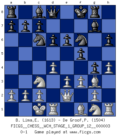 Last move : 0-1 2007 October 4 11:23:38 [Event "FICGS__CHESS__WCH_STAGE_1_GROUP_12__000003"] [Site "FICGS"] [Date "2007.07.11"] [Round "1"] [White "B. Lima,Edmilson"] [Black "De Groof,Pieter"] [Result "0-1"] [WhiteElo "1613"] [BlackElo "1504"] 1.d4 f5 2.Bg5 h6 3.Bh4 g5 4.Bg3 Bg7 5.e3 d6 6.Qh5+ Kf8 7.Nc3 Nf6 8.Qe2 e6 9.O-O-O Nc6 10.f3 Rg8 11.h4 g4 0-1 This chess game has been lost on time (started : 2007.07.11 17:7:55) Dutch, 2.Bg5 variation Queenside Castling by player White (move 9) Player Black won this chess game. Follow this game move after move (download)Some part of a mistake is always correct. (Savielly Tartakover) Schach ist Kampf, hauptsächlich jedoch gegen die eigenen Fehler. (Savielly Grigorievitsch Tartakower) Es el objetivo de la escuela moderna no tratar cada posición de acuerdo a una regla general, sino de acuerdo al principio inherente en la posición. (Richard Reti) 'L'échange des dames est un coup dur pour les deux adversaires...' Un journaliste lors d'une partie du match Spassky-Fischer To steal ideas from one person is plagiarism. To steal from many is research. (Unknown)