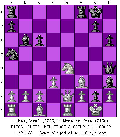 Last move : 1/2-1/2 2020 November 27 18:10:3 [Event "FICGS__CHESS__WCH_STAGE_2_GROUP_01__000022"] [Site "FICGS"] [Date "2020.10.07"] [Round "1"] [White "Lubas,Jozef"] [Black "Moreira,Jose"] [Result "1/2-1/2"] [WhiteElo "2235"] [BlackElo "2150"] 1.e4 e5 2.Nf3 Nc6 3.Bc4 Nf6 4.Ng5 d5 5.exd5 Na5 6.Bb5+ c6 7.dxc6 bxc6 8.Be2 h6 9.Nf3 e4 10.Ne5 Bc5 11.O-O O-O 12.Ng4 Nxg4 13.Bxg4 f5 14.Bh5 f4 15.Nc3 f3 16.Nxe4 fxg2 17.Re1 Qh4 18.Qe2 Bb6 19.d3 Bh3 20.Bf3 1/2-1/2 Follow this game move after move (download)Do you realize Fischer almost never has any bad pieces? He exchanges them, and the bad pieces remain with his opponents. (Yuri Balashov) Die Elozahlen sind sehr schlecht für das Schach. Jetzt ist Schach eine Sportindustrie, die darauf zielt Elopunkte zu machen. (Miguel Najdorf) En la perfecta combinación de Ajedrez como en una historia corta de primera clase, toda la trama y contra trama deberá conducir hacia un final sorprendente, el interes no es mitigado hasta el último momento. (Yates and Winter) On n'a jamais que l'âge auquel on a commence à jouer aux échecs car après on cesse de vieillir. (Capablanca) You must do what you feel is right... of course. (Obi-Wan Kenobi in Star Wars ep.4)